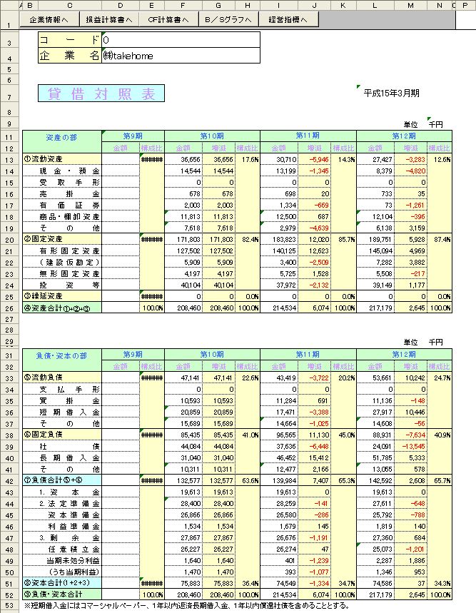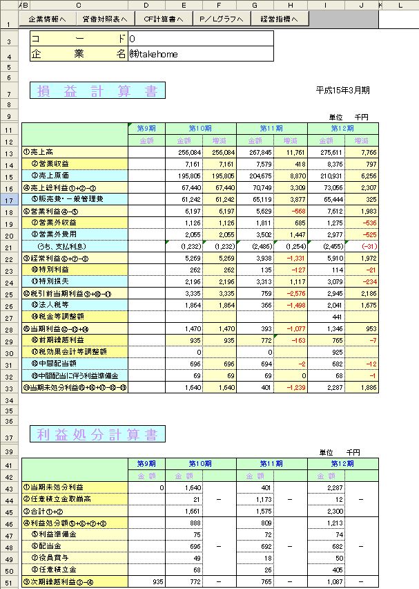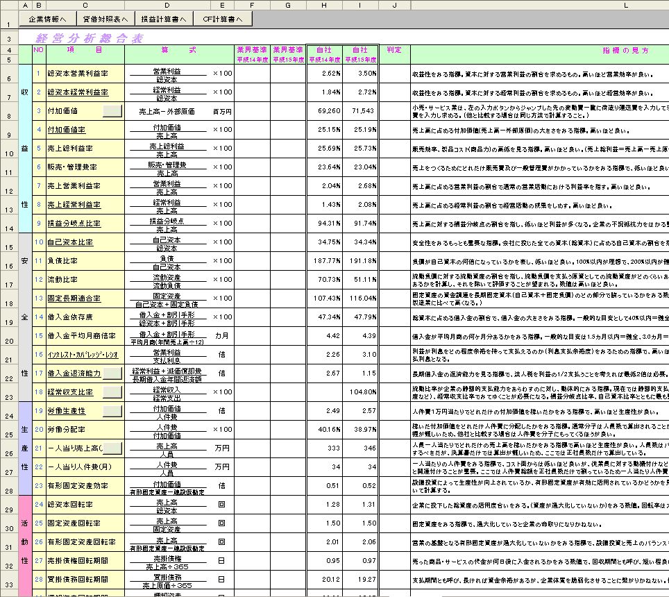 ベース)を使用して診断をおこないます。収益性分析・成長性分析・安全性分析や時系列比較・業界比較によるタテ・ヨコ分析など約40項目に及ぶ指標を元に診断いたします。 なお、本格的な経営分析・指導を求められる場合は、中小企業診断士の先生等をご紹介させていただきます。 以下のイメージは拡大できますので、それぞれの画像をクリックしてください。なお、拡大画像から戻られるときは、お使いのブラウザの戻るボタンを押してください。 <貸借対照表入力画面> 4期分の貸借対照表を入力します。分析結果としては直近2年分のみを使用しますが、4期分の推移をグラフ化することで、ビジュアルに状況を把握することができます。 ![]() <損益計算書入力画面> 貸借対照表と同じく4期分の入力をおこないます。 ![]() <分析結果画面> 分析結果を数値で表します。計算根拠は算式として表示しており、指標の見方も添付していますので、専門知識がなくても状況が把握できます。また経常収支比率など、特に重要と思われる指標にはアンダーラインを引いています。 ![]() @弊事務所で使っている経営分析フォームをフリーソフトとしてアップします。 但し、汎用性を持たせるため、入力項目は簡便化していますので、詳細な分析に は向いておりません。また、経営指標を表しますが、それだけで経営分析はおこ なえるものではありません。あくまでも簡易分析により客観的に数値を読むため の補助ツールとしてお考えください。 Aマクロのコードをオープンにしていますので、エクセルVBAが使える方でし たらご自分にあったように作り変えることができます。 Bメニュー画面にはデータダウンロードのボタンがありますが、上記分析結果画 面の業界基準に合わせてkizyunchi.xlsを作成し、同じフォルダに展開する必要 があります。日経経営指標やTKC経営指標などを元に作成してください。 C本ソフトのご利用にあたり、弊事務所は一切責任を免れることをご承諾いただ く必要があります。すべてはご自身の責任においてご利用ください。 D本ソフトに関するご質問・ご要望にはお答えすることができません。ノーサポ ートであるということをご理解の上、ご利用ください。 上記@〜Dに同意できる方のみ以下のリンクよりダウンロードしてください。 なお、本ソフトはZIP形式で圧縮していますので、解凍ソフトをご利用ください。 経営分析フォームのダウンロード |